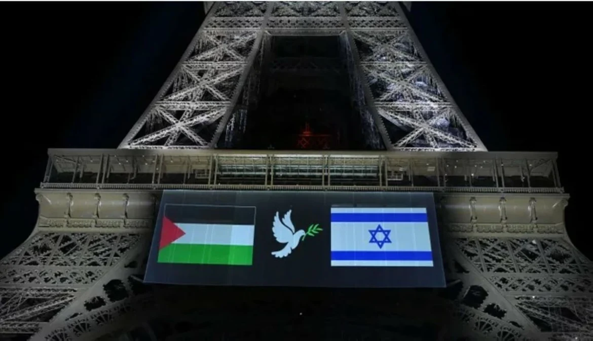 أضاء برج إيفل في باريس، مساء الأحد، أنواره باللون الأبيض، فيما عرضت شاشة مثبتة عليه علما فلسطين وإسرائيل، تفصل بينهما حمامة ترمز للسلام، على النصب التذكاري.ويأتي هذا في الوقت الذي يعتزم فيه عدد من رؤساء البلديات الفرنسية رفع الأعلام الفلسطينية على مباني البلديات اليوم الاثنين، في تحد لتعليمات الحكومة، في الوقت الذي تستعد فيه فرنسا للاعتراف رسميا بدولة فلسطينية خلال اجتماعات الجمعية العامة للأمم المتحدة، وفقا لما ذكرته وكالة أسوشيتد برس.