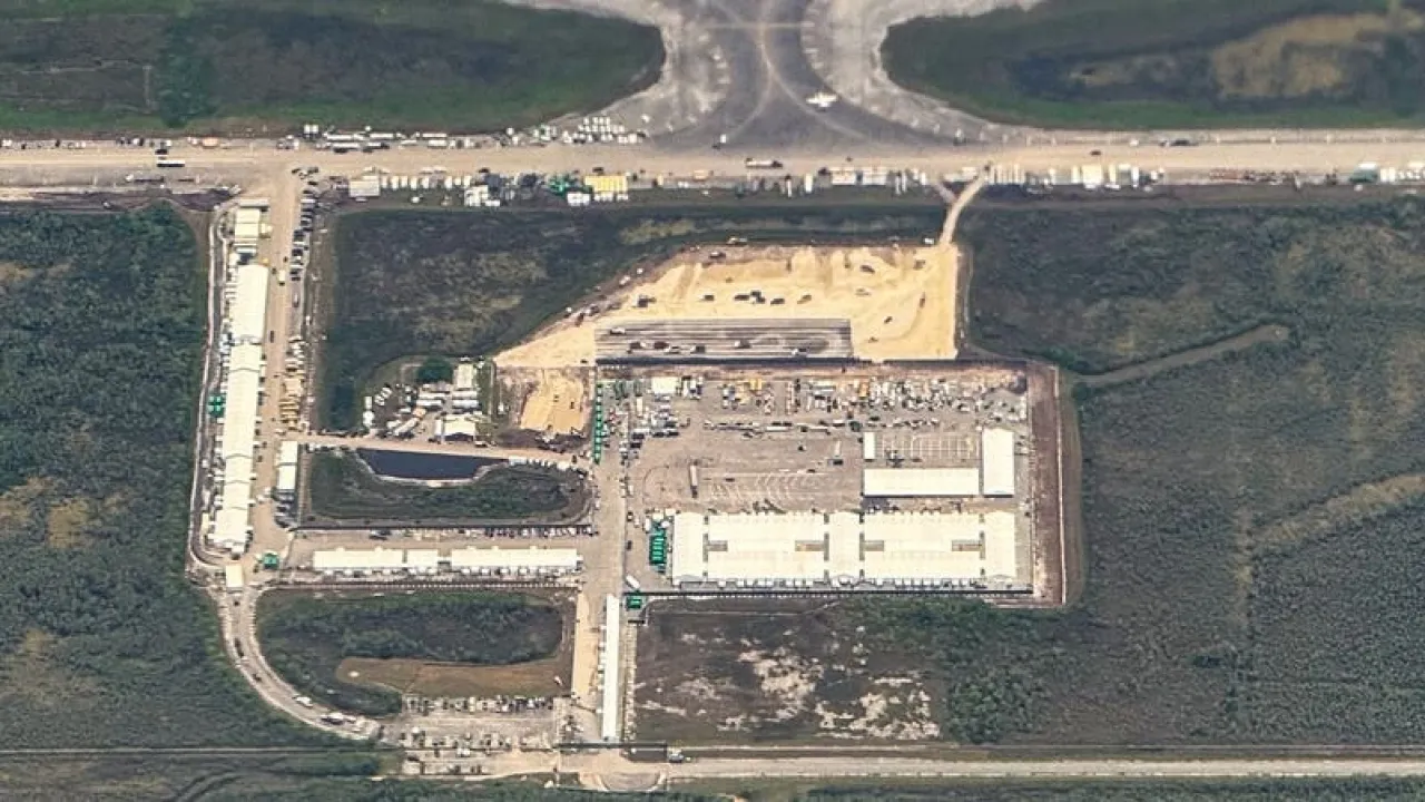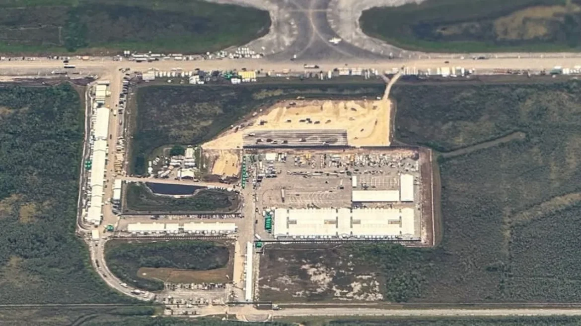 وتم تشييد مركز الاحتجاز في ثمانية أيام فقط في يونيو، مع أسرّة بطبقتين وأقفاص من الأسلاك وخيام بيضاء كبيرة في مطار مهجور في منطقة إيفرغليدز الرطبة في فلوريدا، موطن عدد كبير من التماسيح.