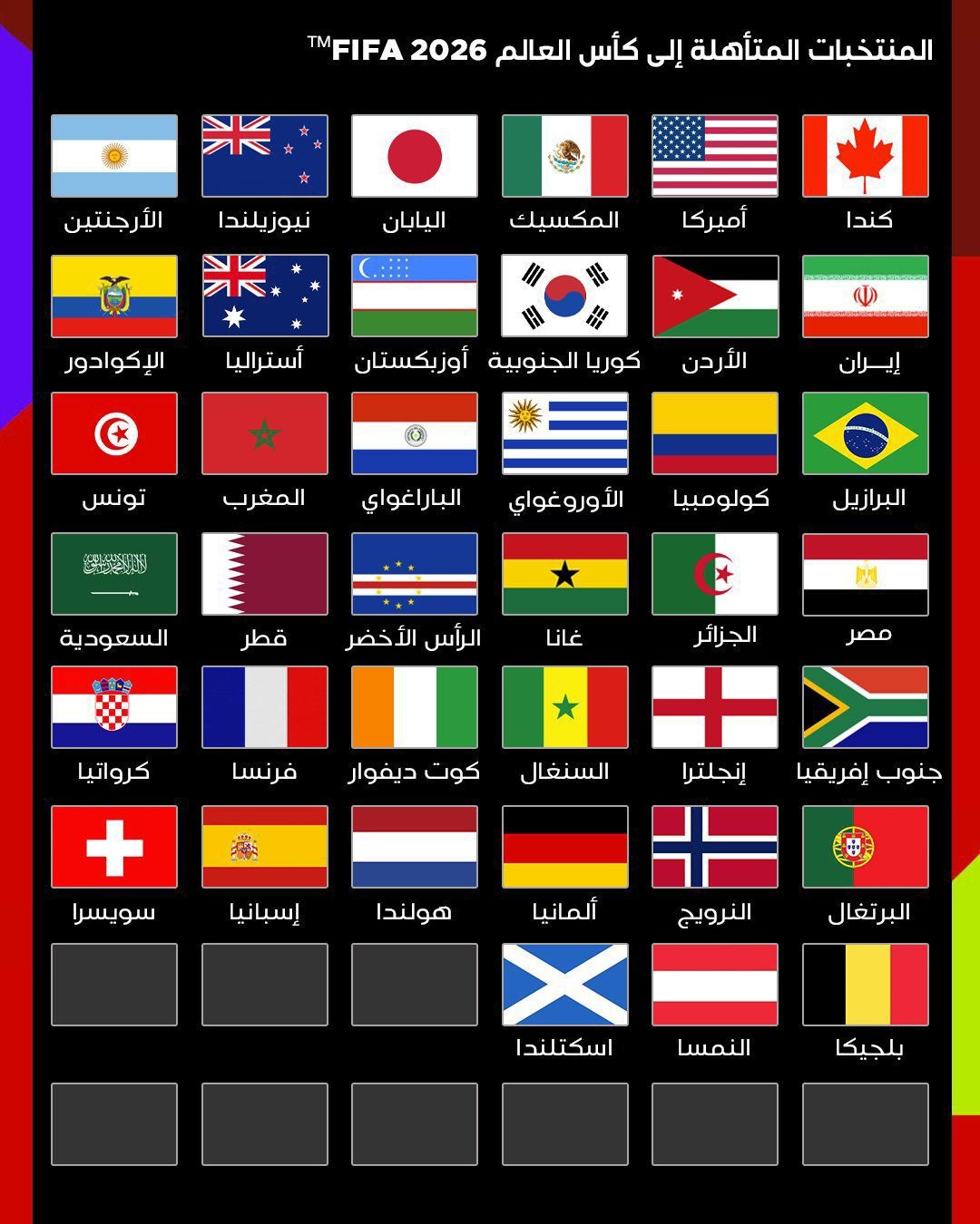 أما المنتخبات العربية، فقد شهدت حضورًا مميزًا بعد تأهل قطر والسعودية والأردن ومصر وتونس والمغرب، ما يعكس تطور كرة القدم في المنطقة واستعدادها لتقديم أداء متميز في البطولة المقبلة.